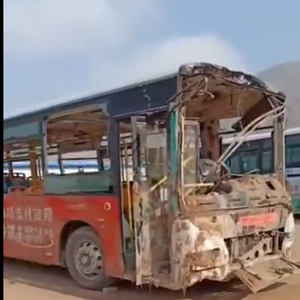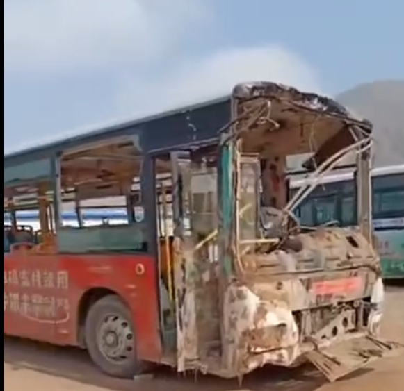涉事公交车当天晚上被吊出。现场视频显示,该公交车受损严重,车身大部分玻璃都已破碎,车头已面目全非,车头、车身还有被火烧过的痕迹。