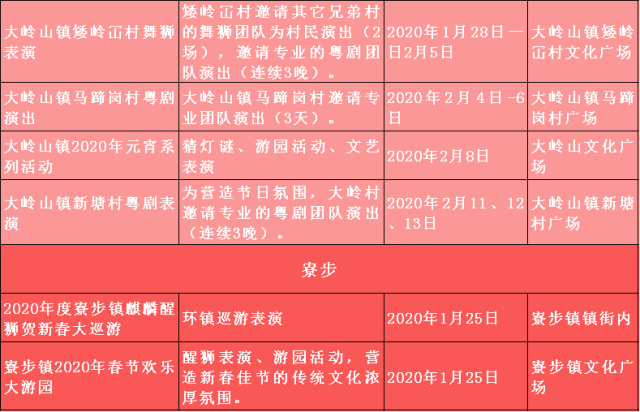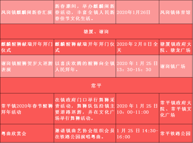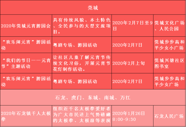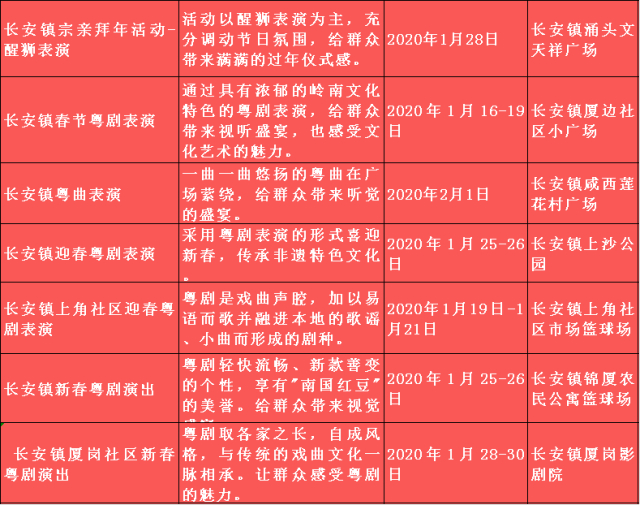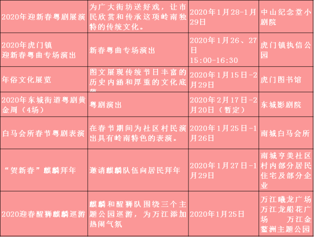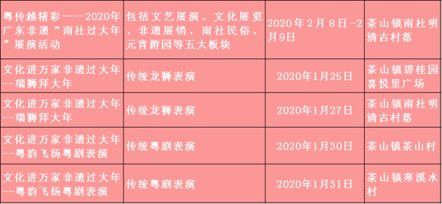 特别需要一提的是,1月25日至2月8日期间,东莞市在茶山镇举办“非遗进万家 南社过大年”2020年东莞市新春非遗嘉年华活动,将利用广东年俗鲜明的时代性、传承性、个性和中华文化元素,为群众搭建情感交流的载体,丰富群众节日精神文化生活。