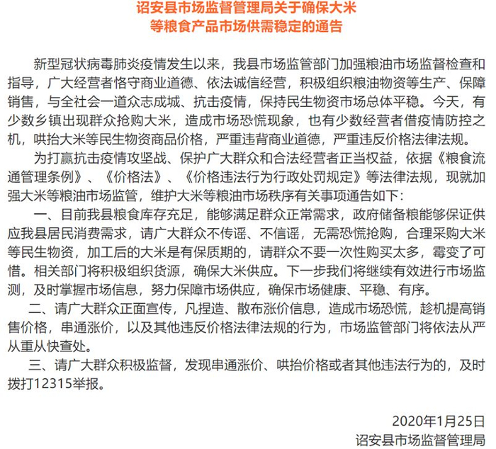 莆田市发改委、市场监督管理局发布公告称,少数经营者借疫情防控之机,哄抬大米等民生物资商品价格,并强调,目前全市粮食库存充足,能够满足群众正常需求,政府储备粮能够保证供应全市居民半年消费需求,“请广大群众不转谣、不信谣,无需恐慌抢购,合理采购大米等民生物资,加工后的大米是有保质期的,市民不要一次性购买太多,霉变了可惜”。