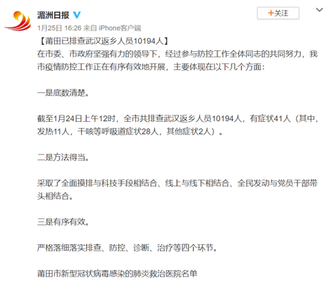 而从莆田市官方统计的数据来看,形势也不可谓不紧张。莆田市公安局及中共莆田市委机关报《湄洲日报》的通报显示,截至1月24日上午12时,全市共排查武汉返乡人员10194人,有症状41人,其中发热11人,干咳等呼吸道症状28人,其他症状2人。尚未说明是否采取隔离措施及相关人数。1月25日下午,莆田市公布64家具有发热门诊的医院名单。