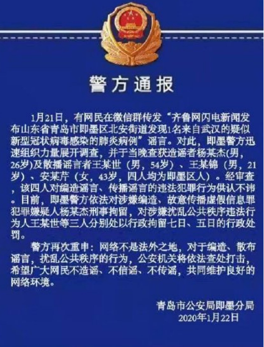 1月21日,有网民在微信群传发“齐鲁网闪电新闻发布山东省青岛市即墨区北安街道发现1名来自武汉的疑似新型冠状病毒感染的肺炎病例”谣言。对此,山东青岛即墨警方迅速组织力量展开调查,并于当晚查获造谣者杨某杰(男,26岁)及散播谣言者王某世(男,54岁)、王某锦(男,21岁)、安某芹(女,43岁,四人均为即墨区人)。即墨警方22日发布通报介绍称,目前,警方依法对涉嫌编造、故意传播虚假信息罪犯罪嫌疑人杨某杰刑事拘留,对涉嫌扰乱公共秩序违法行为人王某世等三人分别处以行政拘留七日、五日的行政处罚。