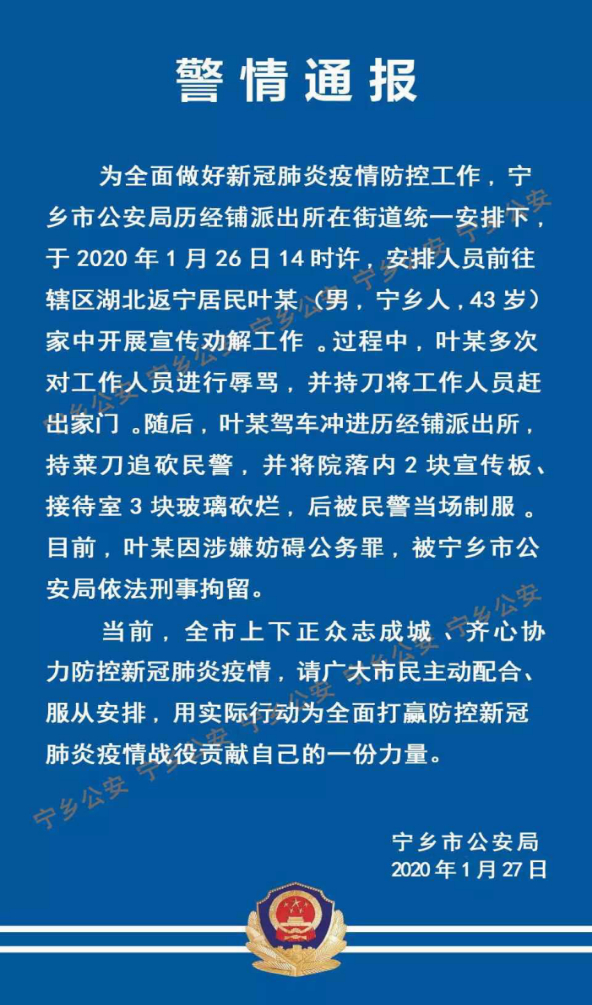 同样在26日,湖南宁乡市公安局历经铺派出所为全面做好新冠肺炎疫情防控工作,于当天下午2点左右,安排人员前往辖区湖北返宁居民叶某家开展宣传劝解工作。但叶某在过程中对工作人员进行辱骂,持刀将他们赶出家门。随后,他还驾车冲进派出所,持菜刀追砍民警,后被民警当场制服。目前,叶某因涉嫌妨碍公务罪,被宁乡市公安局依法刑事拘留。