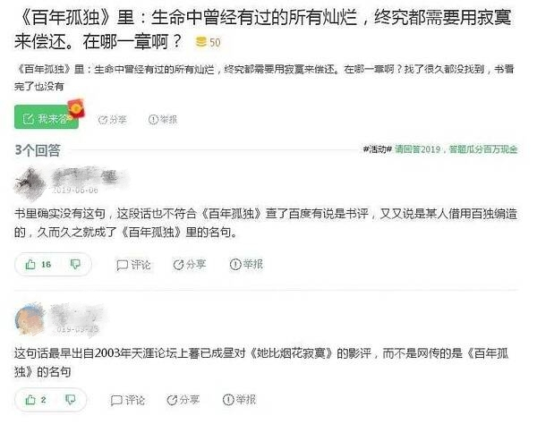 “‘生命中曾经有过的所有灿烂,终究都需要用寂寞来偿还’。在《百年孤独》里在哪一章啊?”“‘愿你出走半生,归来仍是少年’是苏轼的名句吗?”“‘林深时见鹿,海蓝时见鲸,梦醒时见你”,求这句话的出处和含义?”类似网红名句比比皆是,往往标明出自某位名家或某部知名文学作品,有人乐于接受和引用,也有许多好学网友考证源流。但在网络上,答案往往真伪难辨,比如有人指出“生命中曾经有过的所有灿烂,终究都需要用寂寞来偿还”并非出自《百年孤独》,而是来自2003年天涯论坛上暮已成昼对《她比烟花寂寞》的影评。