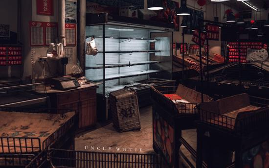 老白:疫情后第一次出去拍摄是在离汉通道关闭那天,早上6点多,朋友给我打了个电话,提醒我赶快去采购一些物资,我们去了菜市场、两个超市,还有加油站。菜市场的东西都被抢购光了,超市是在一个商圈里,平时很热闹的,但是当时商场基本都关了,只有超市开着,里面排队的人也非常多,有一种紧迫感。