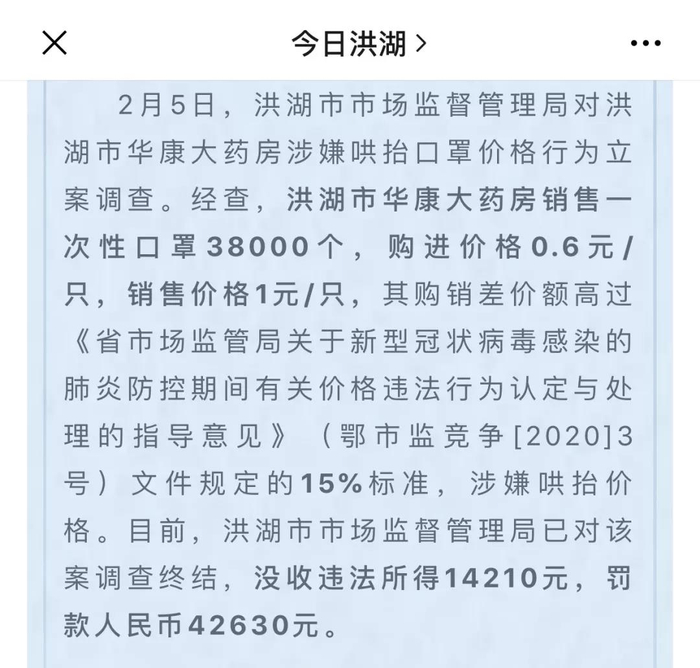 通告表示,洪湖市华康大药房销售一次性口罩38000个,购进价格0.6元/只,销售价格1元/只,其购销差价额高过《省市场监管局关于新型冠状病毒感染的肺炎防控期间有关价格违法行为认定与处理的指导意见》文件规定的15%标准,涉嫌哄抬价格。目前,洪湖市市场监督管理局已对该案调查终结,没收违法所得14210元,罚款人民币42630元。