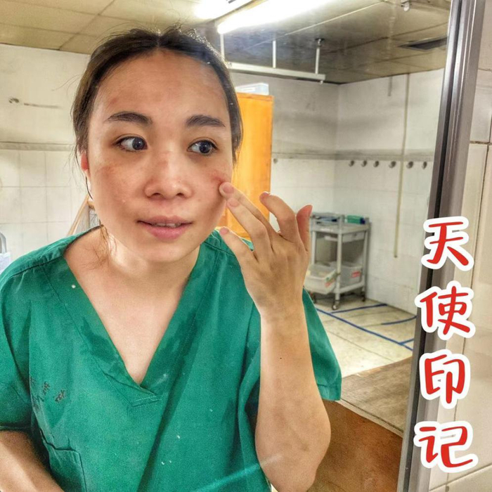 作为九院工作区里年龄最小的医疗工作人员,刚开始工作的袁焕仪因为快速的工作节奏、新系统新知识需要学习的压力、以及对自己可能会拖团队后腿的担忧和害怕,晚上经常睡不着。她只能在工作之余,抽空将自己并不是十分熟练的知识进行再一次的学习,即便是难得有放假休息的时间,她也是在学习和接受新型冠状病毒新知识的培训中度过。忙碌的她,想念家人也只能在每天吃饭的时候和亲人进行视频通话。努力的她,在工作期间忙起来都不觉得劳累,只有在下班休息的时候,才会开始感觉到腰疼脚痛,戴了一整天护目镜和N95口罩的脸蛋更是旧痕未消,明天加重。