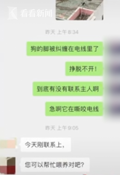 情况紧急,@狗遛的小杜 不断联系物业,最后物业终于跟主人取得了联系,主人说他在老家回不来了,经主人的同意,物业将狗救了下来,并暂时由@狗遛的小杜收养。