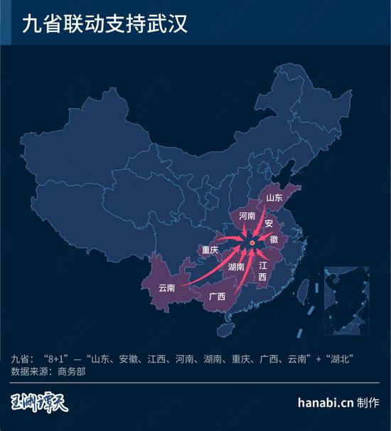 在这张图上,有8条明显的“主动脉”,分别来自山东、安徽、江西、河南、湖南、重庆、广西、云南等八个省区市。早在1月23日,商务部就已经协调他们与湖北建立了联保联供协作机制。