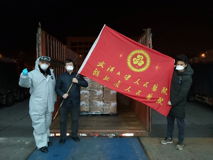 1月24日下午,大年三十,1药网联合创始人兼执行董事长于刚校友捐赠的10万多只医用口罩运抵武大,蹇宏率领应急小分队前往校医院接收,并当场分配给武汉大学中南医院、校医院、汉警快骑、北湖派出所等单位。这是最早一批直接捐赠给武汉市内医疗机构的防护物资。