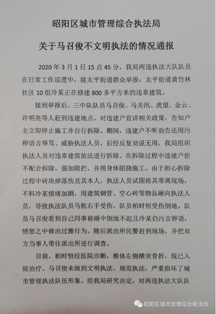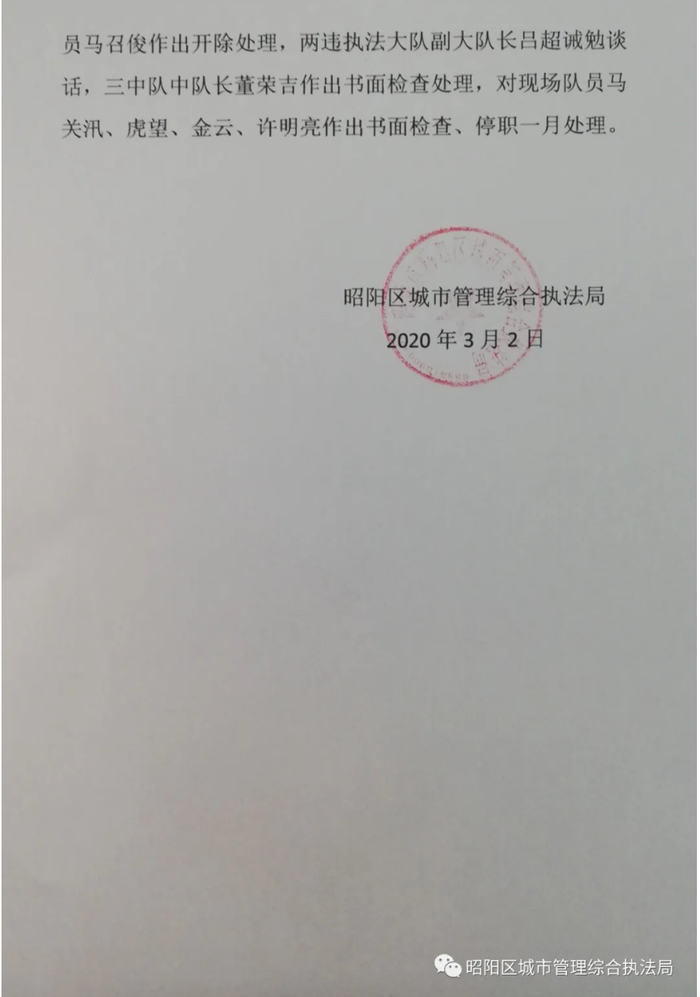云南昭通城管队员拆除违建现场与当事人发生冲突,一人被开除 澎湃新闻 澎湃新闻官方账号 2020.03.0222:57 关注 原标题:云南昭通城管队员拆除违建现场与当事人发生冲突,一人被开除 来源:微信公众号“昭阳区城市管理综合执法局”