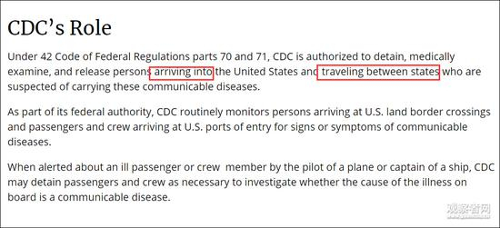 观察者网注意到,美国疾控中心就疫区归国人员隔离政策的说明中明确强调,该机构会对“入境美国”或“跨州”疑似感染人员采取强制措施;此外,该机构仅对“入境美国时”的人员进行监控,并未提及会对“居家隔离”人员进行监控。