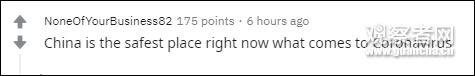 譬如排名首位的评论写道:“我宁愿在中国得新冠肺炎也不要在北美感染。现在他们(中国)有经验,有足够的检测能力,有足够的医疗资源来应对这场疫情。很多人一直在批评中国做的不对,但我觉得如果搞不清楚疫情的严重程度,现在批评中国为时过早。