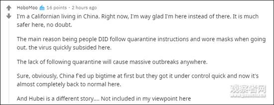一位现居中国的美国人写道:“我就是加州人,生活在中国,而且现在我很感激自己还留在中国。这里无疑更加安全。这主要是因为,人们真的会遵守隔离措施,出门会戴口罩。所以疫情很快得到了缓和。如果人们不遵守隔离措施,疫情到哪儿都会爆发。当然,中国一开始做的不够好,但现在很快就控制住了疫情。现在基本上生活几乎要回到以前的样子。不过湖北不一样……我的观点不涉及湖北。”