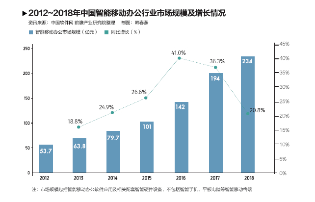 一些行业研究表明,长远来看,整个远程办公市场在这次爆发式增长后,将突破过去的瓶颈,进入上升周期。根据第一财经联合钉钉发布的数据显示,我国在线办公市场规模过去保持了稳步增长。2012年市场规模是53.7亿元,2017年是194.4亿元,2020年预计是478.3亿元。但今年,受疫情的影响导致在线办公需求爆发,行业发展提速,预计2020年有望突破500亿元。