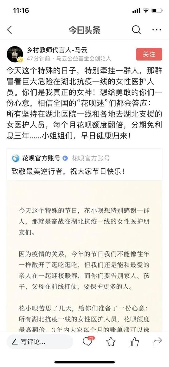 今天是三八国际妇女节,湖北疫情一线的女医护人员收到了马云的一份特殊礼物:每个月花呗额度翻倍、分期免利息三年。这份突如其来的心意,被医护人员和网友点赞暖心,称马云为“暖宝宝”。有医护人员在社交媒体上晒图:没想到从马云这收到了最想收的2朵花:鲜花和尽情花。