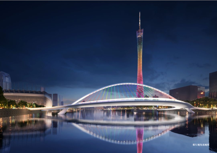珠江两岸的花城广场、海心沙、广州塔都是广州的人气地标,但长期以来,三地联动较少,要从花城广场步行到广州塔需绕行二沙岛,耗时很长。本项目拟在广州塔西侧建设步行桥跨越珠江,叠于广州新城市中轴线之上。