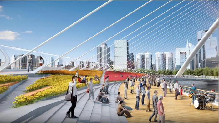 借鉴英国泰晤士河等先进理念,规划建设连接二沙岛与广州塔的人行景观桥,实现珠江两岸慢行交通互联互通,提高集聚人流的快速疏散能力,整体提升花城广场、海心沙、二沙岛、广州塔等区域环境品质。