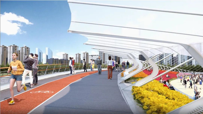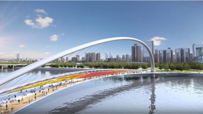 主桥采用主跨240米钢结构斜拱桥,桥梁东侧桥面全长约451米,西侧主梁全长约296米。人行桥跨中总宽20米,其中西侧桥面宽6米,东侧桥面宽8米,中部梯道宽6米。整个工程占地面积约15025.9平方米,其中占河道约9329.6平方米、陆地约5696.3平方米。