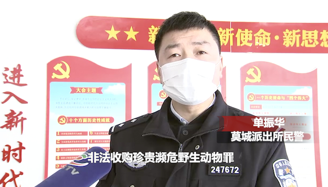 莫城派出所民警单振华:“现在我们以涉嫌非法收购珍贵濒危野生动物罪,对犯罪嫌疑人吴某采取取保候审的强制措施。”