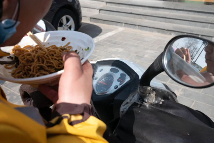 早餐和午餐的订单高峰过后,常玉鹏可以喘口气。他会在商家门口找个不妨碍人的角落坐下,一边等单一边歇会儿。有时候他能感受到善意。一些熟识的餐馆老板照顾,夏天请他进屋吹空调,冬天就给打点热水。那是在外打拼的人,彼此间的体谅和关照。