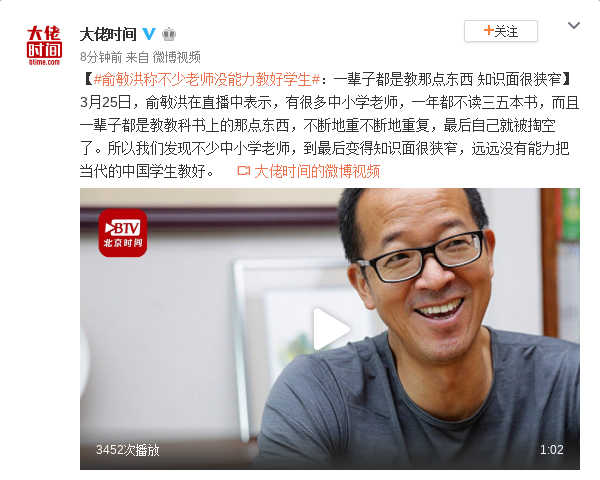 视频-俞敏洪称不少老师没能力教好学生:一辈子都是教那点东西 知识面很狭窄