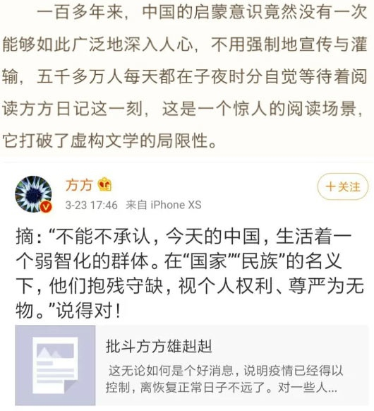 另一部分粉丝政治色彩比较浓厚,可以称为启蒙派、良心派。他们的观点浅白、常识,一看可知,主要就是高扬个人权利,反对歌功颂德,揭露黑暗真相。方方最后一篇日记,骂骂极左、把中美大国博弈贬作“政客互怼”,只有医生合作是人道主义携手大爱。粉丝们高喊“良心”、“启蒙”、“如果极左横行,改革必定失败”,然后合唱一曲“那美好的仗我已经打过;当跑的路我已经跑尽;所信的道我已经守住”,光荣散场。