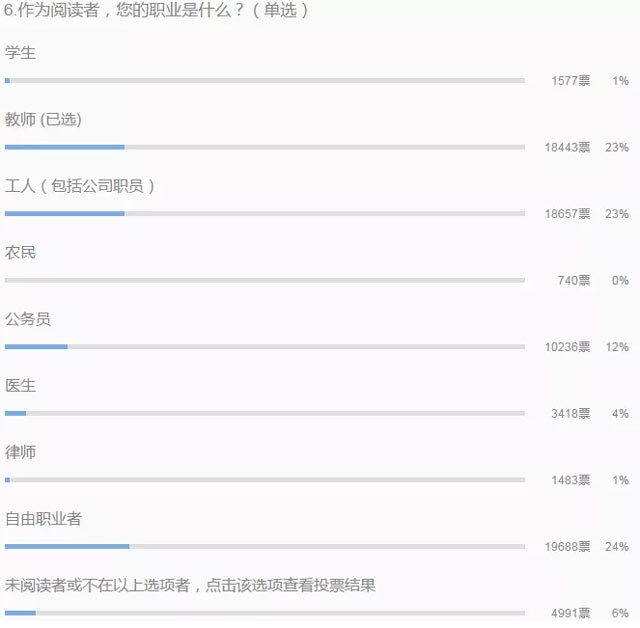 我观察下来,这部分粉丝以学校文史圈师生、作协文联的文化人、体制内不满者和媒体人为主力,年纪都比较大。反对方方的人则遍布B站、知乎等年轻人社区,微博上的反对者也以年轻人为多。有方方粉丝搞了一个读者调查,显示粉丝组成里教师、公务员比例极高,50、60、70后读者占了80%以上,基本映证了我的观察。