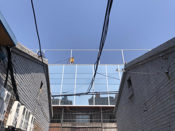 记者驻足看到,空中时不时有鸟类飞过并发出鸟叫声。该玻璃幕墙位于北怀里小区18号楼和19号楼居民楼中间的两层建筑上,建筑的后方(孟家胡同)墙面也为玻璃幕墙。“这地方之前是公厕,现在盖成房子了。”有附近居民告诉记者。