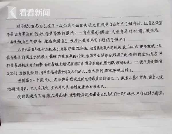 他在遗书中说:“对不起,我尽力了。在下一次让自己如此失望之前,还是自己早点了结为好。”