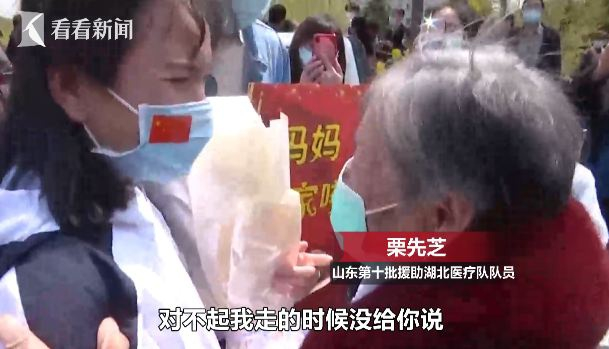 4月5号山东援助湖北第二批返鲁人员结束休整返程回家时,在枣庄欢迎现场发生了感人一幕。山东援助湖北医疗队的一名女护士栗先芝瞒着年近九旬的母亲去湖北支援,如今平安回来,母亲不顾自己年纪大、亲自来到现场迎接闺女。对母亲的思念与内疚之情交织在一起,栗先芝一见到母亲便跪地道歉。
