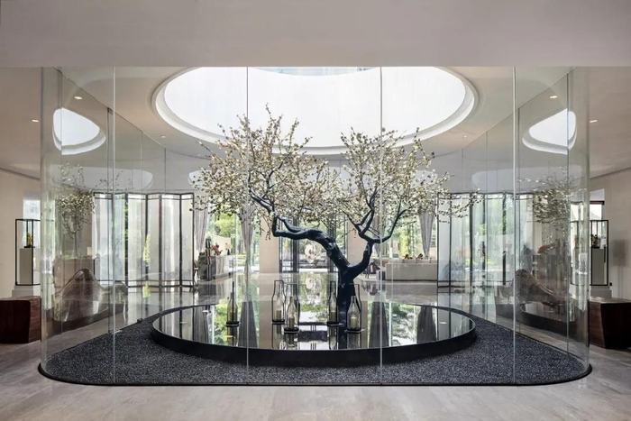 重达800公斤的一体化三层夹胶玻璃,实现110席黄旗山无遮挡全景大宅。设计师在西方设计理念中融入中国山水画中的瀑布、远山等元素,创造现代高台式园林,古今交汇,中西结合,以小见大,由远及近,带来舒适的休闲体验。