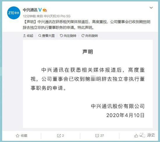 4月9日,杰瑞集团发表声明,称获悉媒体相关报道后,高度重视,当日下午集团已与鲍某明协商解除了劳动合同。4月10日,中兴通讯官方微博也发布声明称,中兴通讯在获悉相关媒体报道后,高度重视,公司董事会已收到鲍某明辞去独立非执行董事职务的申请。