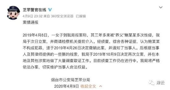 2020年4月9日夜间,山东省烟台市公安局芝罘分局发布案情通报,称鲍某明涉嫌性侵“养女”案侦查工作仍在进行中。