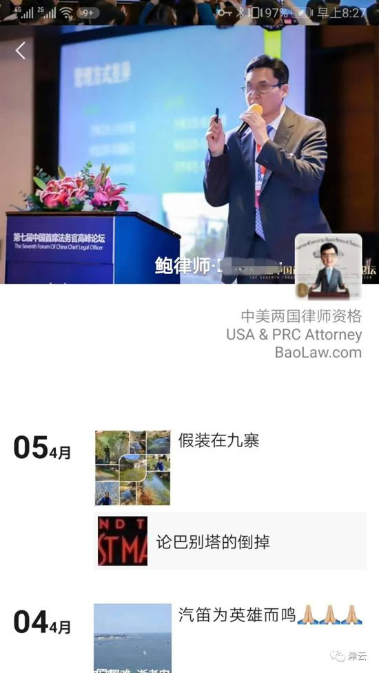 该律师向记者提供了几张鲍某明朋友圈的照片,记者看到,鲍某明的朋友圈里有很多类似于感恩的帖子和字眼,他朋友圈的最后一条信息发布于4月5日,像是一组旅游照片,照片说明为“假装在九寨”。