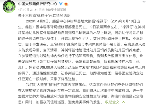 4月10日晚间,中国大熊猫保护研究中心官方微博发布消息:9日,熊猫中心神树坪基地大熊猫“禄禄仔”(2019年8月10日出生,雌性)因丰容吊球绳缠绕颈部窒息死亡。