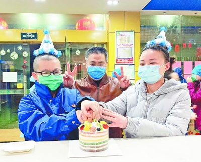 2月20日,来自江苏、湖南、河南、陕西以及天津的18位中医医疗队员,在驻地东湖学院过了一场难忘的集体“战地生日”。负责对接服务的江夏区机关事务服务中心干部涂平说,当时正是疫情严重的时候,外面根本买不到蛋糕,他和同事四处打听,得知同事的朋友是一位糕点师,受疫情影响一直待在家里,他们赶紧联系到糕点师,并从酒店集齐制作蛋糕需要的鸡蛋、奶油、面粉等原料送到糕点师家中,为过生日的“寿星”订制了5个大蛋糕。