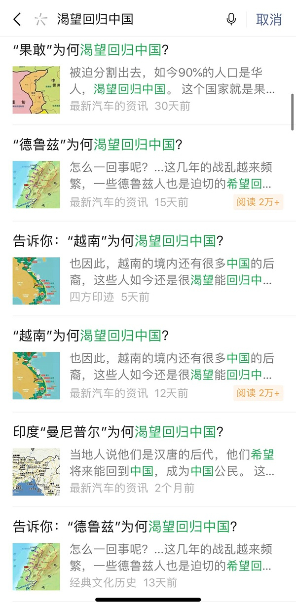 澎湃新闻发现,多篇“XX国渴望回归中国”文章内容如出一辙。此类文章一般先描述其他国家与中国的历史渊源,再找出两地居民的一些共同点,称“某某国自称中国人也是有道理的”,最后点出中国现在发展迅速,然后抛出“越来越多某某国人希望回归中国”的结论。