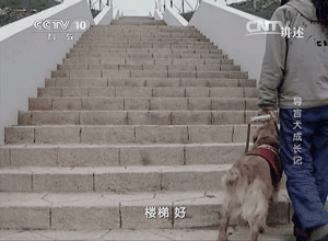 上台阶时,导盲犬需要把两只前脚踩在台阶上提醒主人。