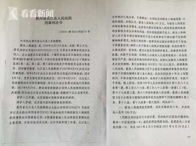“录音录像在哪里,有无非法取证,这关乎韩建旻的人生,我们一家人的命运,关乎法律的公平与正义。”韩建旻的妻子段女士说,从2017年11月至2019年3月8日,按照从江县检察院、法院的要求,她通过向朋友借款等方式多方筹措,退赃缴纳罚金共计730万元。“2019年3月6日,一审律师分别会见了从江县法院原副院长潘俊崇、院长石全忠。二人均劝说要积极配合,本案可以从轻处理。石院长说,在审委会上检察院工作人员要求缴纳700多万元。”