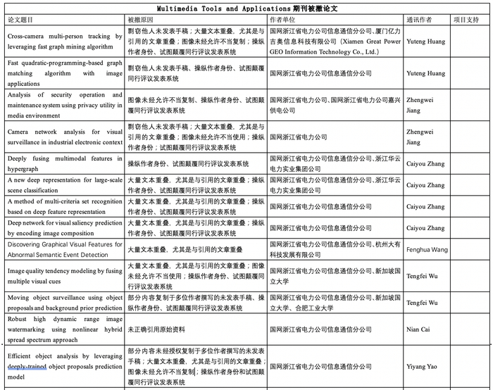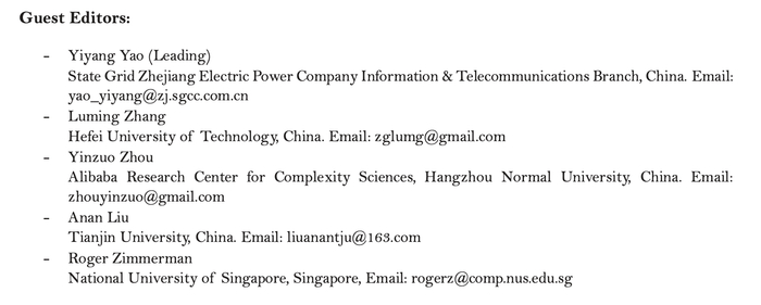 巧合的是,该特刊的客座编辑(Guest Editors)分别来自国网浙江省电力公司信息通信分公司(State Grid Zhejiang Electric Power Company Information & Telecommunications Branch)、合肥工业大学(Hefei University of Technology)、阿里巴巴复杂科学研究中心(Alibaba Research Center for Complexity Sciences)、天津大学(Tianjin University)、新加坡国立大学(National University of Singapore)。新加坡国立大学被撤的两篇论文与国网浙江省电力公司信息通信分公司有合作。