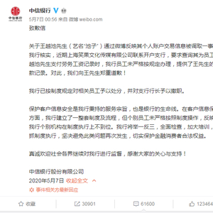 今天是5月8日,昨天凌晨,中信银行就泄露客户信息事件发布致歉信,称系员工未严格按规定办理导致,已按制度规定对相关员工予以处分,并对支行行长予以撤职。目前,监管部门已介入调查。我们看看主播郭志坚想说些什么。