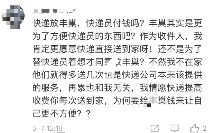 而对于丰巢快递柜的收费规则,更多网友的情绪在于,对快递员未经允许直接将包裹放入快递柜的不满。