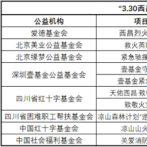 3月30日,四川省凉山州发生森林火灾并再次出现地方扑火人员重大伤亡事件,带走了19位“英雄”的生命。事故一出,多家基金会展开救援及灾后安抚活动,并在民政部指定的互联网募捐信息平台上展开募捐活动。
