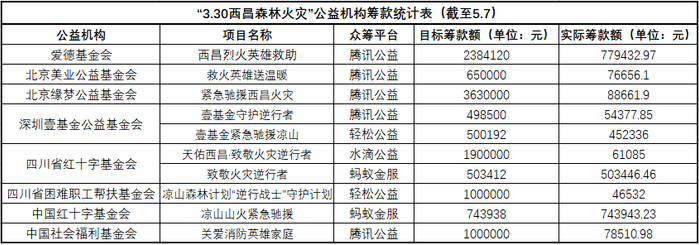 截至5月7日,共有8家基金会针对此次火灾开展了网络募捐,分别是爱德基金会、北京美业公益基金会、北京缘梦公益基金会、深圳壹基金公益基金会、四川省红十字基金会、四川省困难职工帮扶基金会、中国红十字基金会、中国社会福利基金会。他们在腾讯公益、蚂蚁金服、水滴公益和轻松公益等四个平台上线10个项目,已募捐2884982.49元,目标完成度22.52%。
