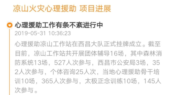 中国妇女发展基金会在蚂蚁金服募款500059.29元。2019年4月,中国科学院心理所执行木里火灾后幸存森林消防指战员及遇难家属的个体咨询、团体辅导、队伍建设和心理空间建设等相关活动。项目已经执行完毕,受疫情影响,5月15日专家组将去收尾,5月底会提交正式的结项报告。