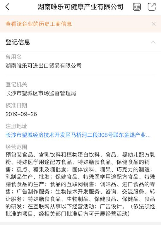 天眼查信息显示,湖南唯乐可健康产业有限公司经营范围包括预包装食品、包括含乳饮料和植物蛋白饮料、食品、婴幼儿配方乳粉、特殊医学用途配方食品、固体饮料、特殊膳食食品、保健食品的销售等。