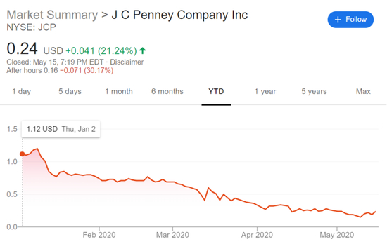 从股价上看,今年1月以来,该公司股价跌破1美元后一路走低。在本周五(15日)盘后时段,彭尼百货股价跌到只剩16美分。