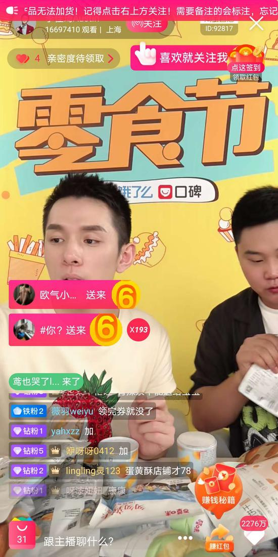 5月17日,正好是电商打造的“零食节”。老方吃完晚饭,就抱着手机,开始看李佳琦的直播带货。没想到,这一看就是4个小时。从7点半一直持续到11点半。老方被高节奏的带货频率,整得不知所措,“手机屏幕那个闪呦,就没停过,不停地有人在发那个……叫什么,是评论还是叫‘弹幕’?我都不知道该点哪儿。”