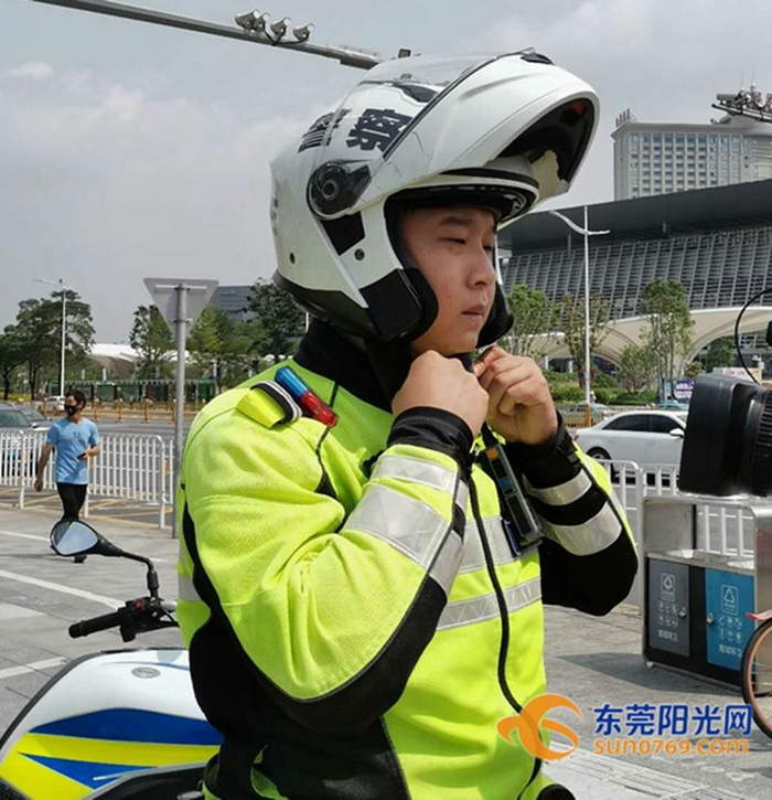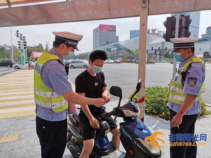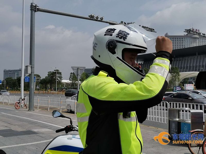 南城交警劝导机动车驾驶人佩戴头盔