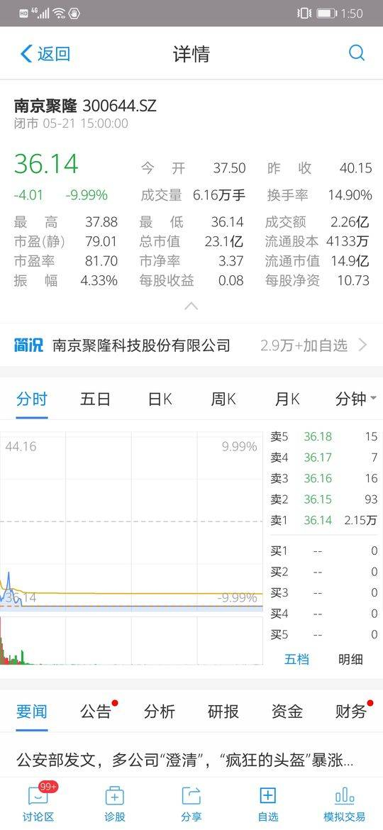 5月21日,南京聚隆股价应声下跌,截至收盘报36.14元,下跌9.99%;国立科技以10元3毛6分收盘,下跌5.22%。